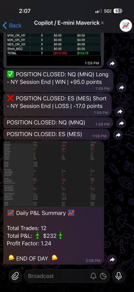 Friday’s live futures trading session in the E-mini Maverick trading room finished with 12 trades across MNQ, MES, closing at +$232.40 with a profit factor of 1.24. Choppy CPI day — shorts carried the session with a 50% win rate on the short side vs 25% on longs. Good discipline on a volatile macro Friday.