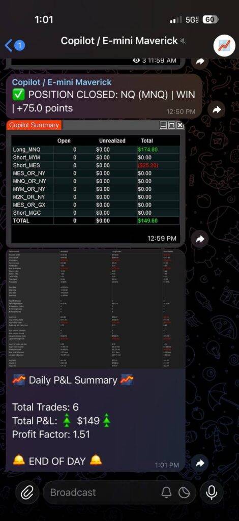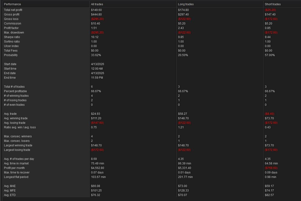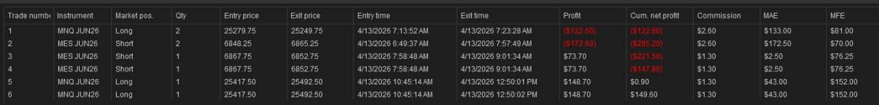 Monday’s live futures trading session in the E-mini Maverick trading room finished with 6 trades across MNQ, MYM, MES, closing at +$149.60 with a profit factor of 1.51. Disciplined session on a volatile geopolitical open — Iran ceasefire collapse and Navy blockade news kept the market choppy. Longs carried the day (+$174.80), shorts were a slight drag (-$25.20).