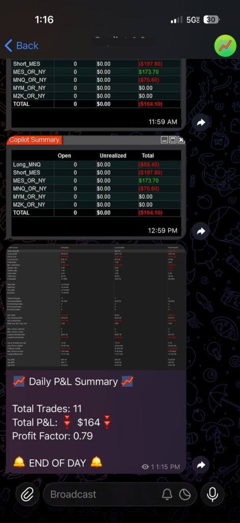 Friday’s live futures trading session in the E-mini Maverick trading room finished with 11 trades across MNQ, MES, closing at -$164.10 with a profit factor of 0.79. A minor setback, but risk was managed well.