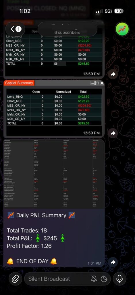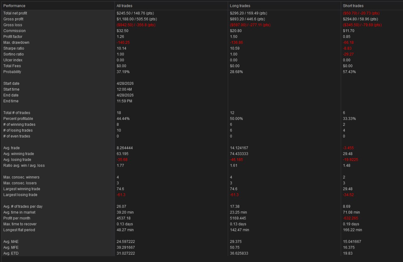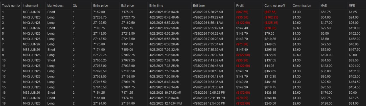 Tuesday’s live futures trading session closed at +$245.50 across 18 trades in MNQ and MES, with a profit factor of 1.26. The long side did the heavy lifting going 6 for 12 for +$296.20, while the shorts were a drag at 2 for 6. High volume day with 4 consecutive winners on the long side keeping the cumulative P&L climbing through the afternoon.