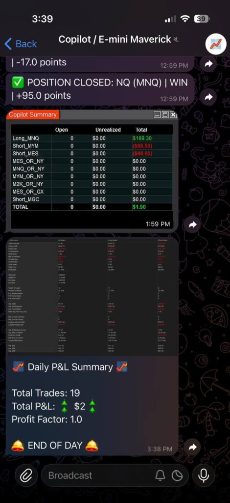 Wednesday’s live futures trading session in the E-mini Maverick trading room finished with 19 trades across MNQ, MYM, MES, closing at +$1.90 with a profit factor of 1.00. A grind of a session on a volatile gap-up day driven by the US-Iran ceasefire announcement. Flat is a win when the market throws 800-point overnight gaps at you.