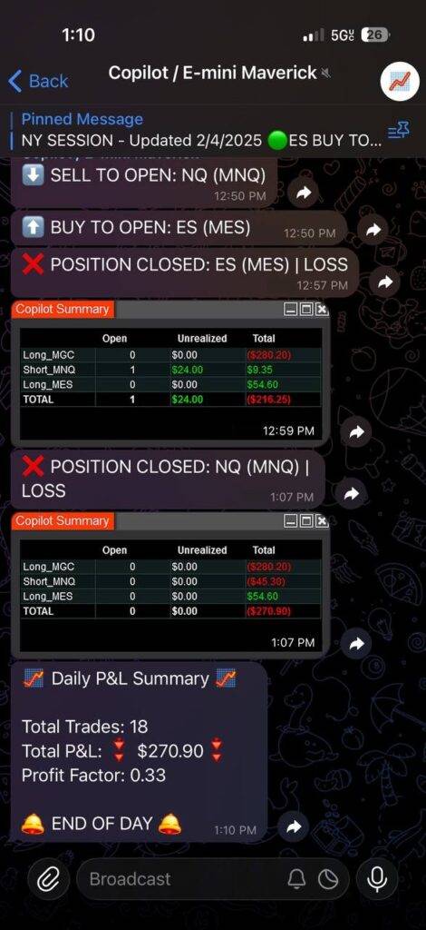 Tuesday’s session across MES, MGC, and MNQ finished in the red at -$270.90 on 18 trades with a 0.33 profit factor. A CME data outage disrupted the MGC feed mid-session, creating fills and behavior that would not have occurred under normal conditions. No excuses on the P&L, but a red flag worth logging on the tech stack side.